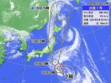 台風7号は15日午後3時、父島の東北東の海上にあり、
