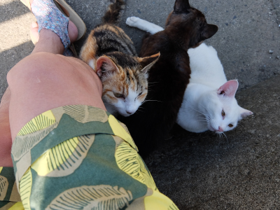 足に擦り寄ってくるユキちゃんとクリティカを撫でながら
