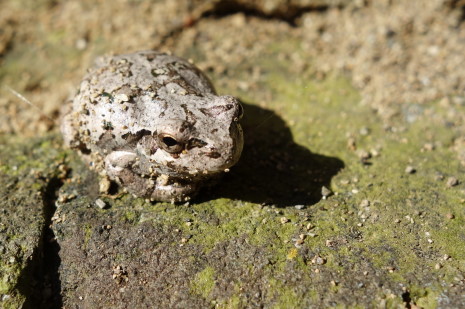 狛犬の土台の上でアマガエルが日向ぼっこしてた