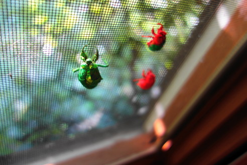 画像の右側の 赤色のふたつ は小さいニイニイゼミの抜け殻で