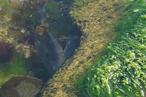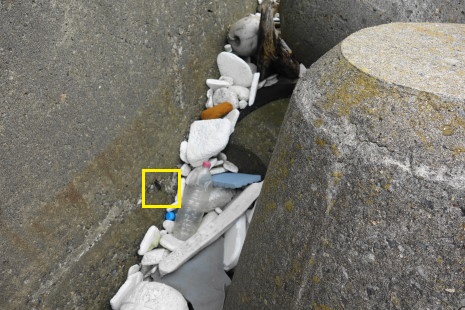 防波壁のひび割れの隙間に頭を突っ込んで隠れようとしてるのか?