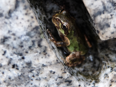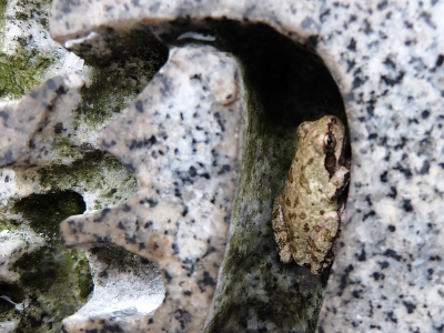 しゃがみ込んで拝んでいる目線の高さにカエルいる........