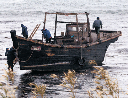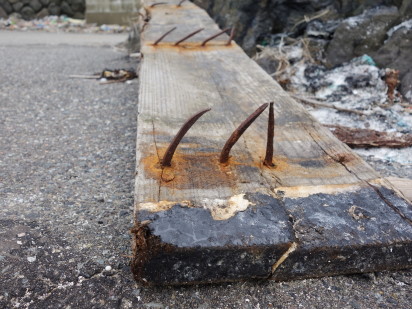 このようなコールタールが塗られた船の残骸を浜で見つけるのは