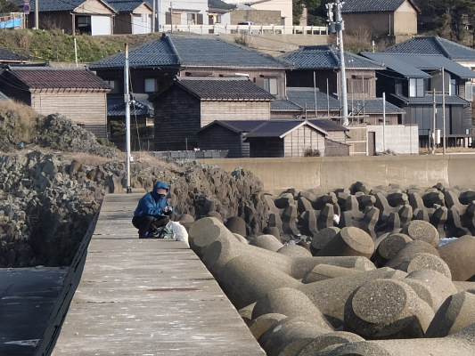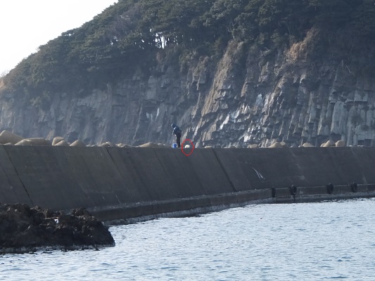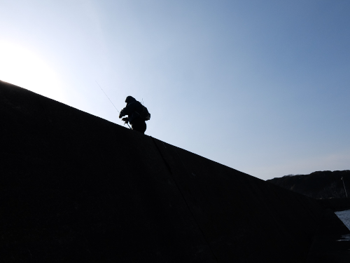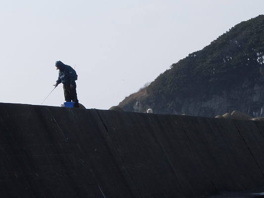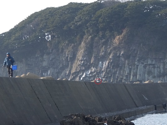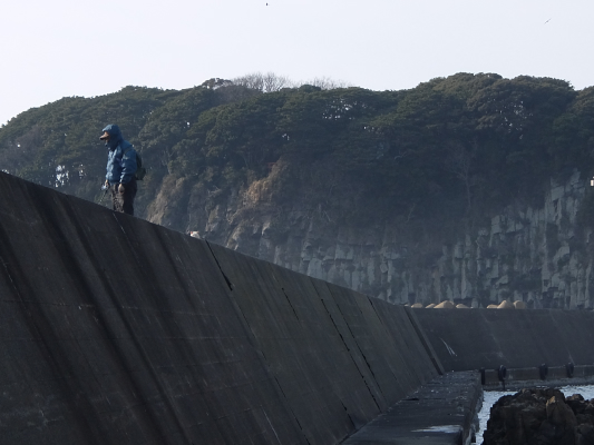 長突堤の釣人が根元の岩場から降りてきたので