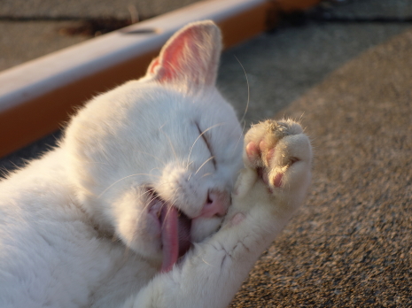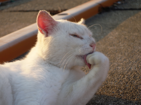 シロクンは口元のお魚の脂をお掃除中